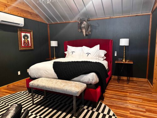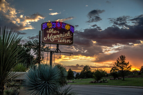 The Maverick Inn is one of the oldest continuously operating motor lodges in the United States, positioning itself as a “Roadhouse for Wanderers.” Established in 1927 as a rustic tourist camp, it has been renovated into a boutique motel that captures a vintage West Texas vibe through its Southwestern and Mexican-inspired architecture. Its 21 guest rooms are individually decorated with Saltillo tile floors, wood-beamed ceilings, and framed prints by legendary photographer Edward S. Curtis. The grounds include an outdoor “chili bean” shaped swimming pool, a courtyard fire pit, and designated picnic areas for a communal atmosphere.